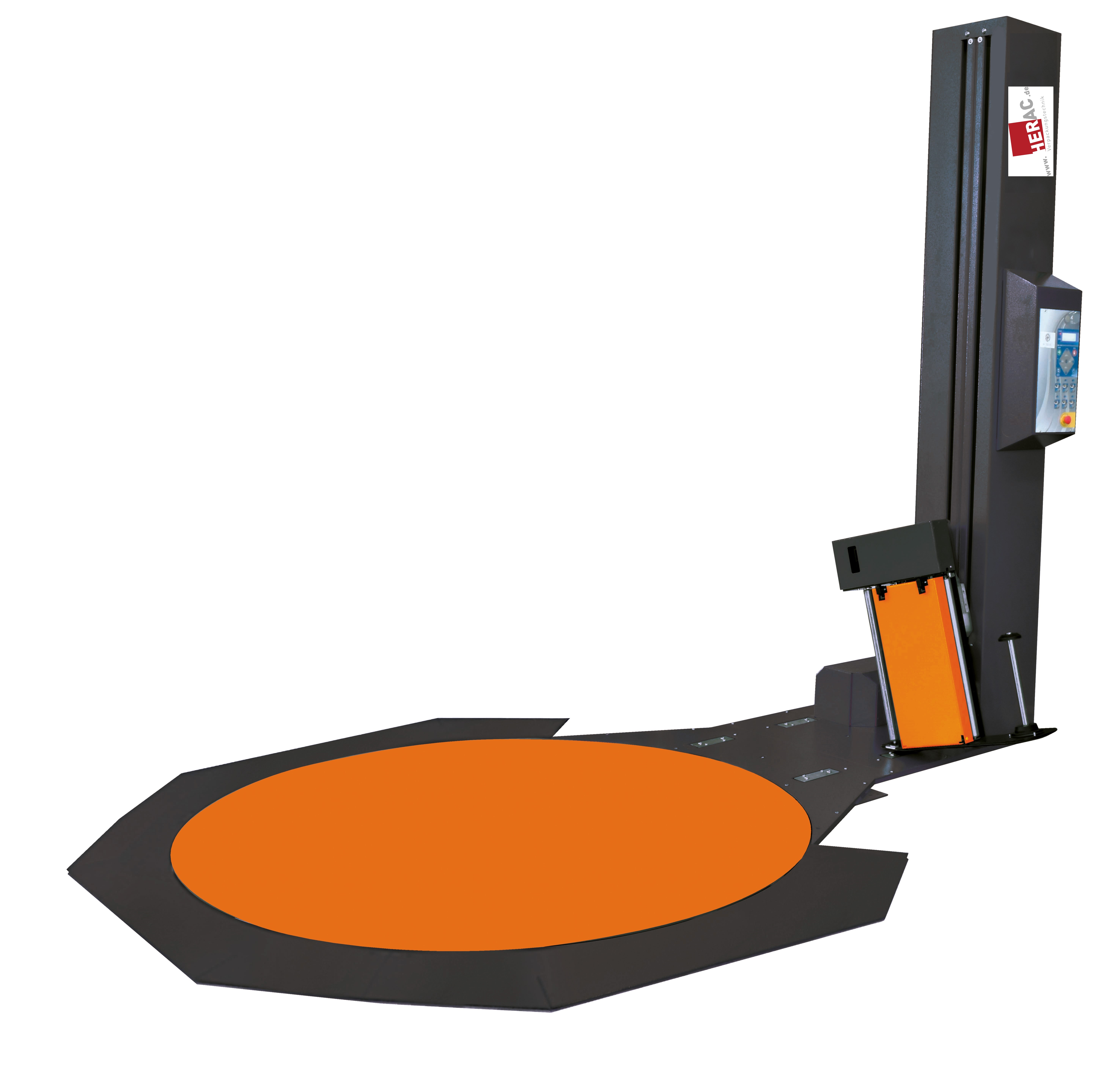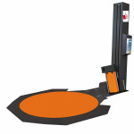 Innovative Wickelanlage zum Sichern von Euro- und Industriepaletten mit Stretchfolie. Die Drehtellerhöhe beträgt nur 18 mm. So können die Paletten über eine kurze Rampe oder eine Ringrampe mit Handhubwagen oder Elektroameise leicht auf dem Drehteller positioniert werden.