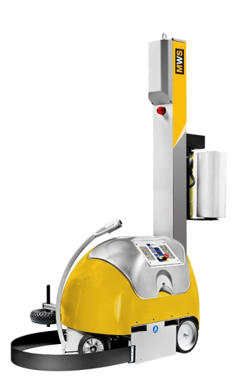 Der MWS ist ein mobiles Gerät für die schnelle und sichere Verpackung von leichten oder empfindlichen Waren auf Paletten. Die Maschine ist leicht zu bedienen und bewegt sich mit einem Platzbedarf von 1.250 mm um die Palette.
